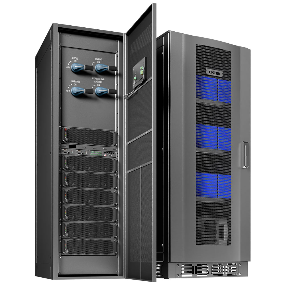Силовые модули 100 кВА. Возможна горячая замена силовых модулей, модуля байпаса и плат управления. Функции самотестирования, холодного старта, преобразователя частоты. Совместим с литиевыми батареями. Спроектирован для самого мощного промышленного оборудования.